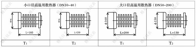 型號中出現(xiàn)T2為高溫流量計,用于60-120℃帶發(fā)信器,配置短性散熱器。